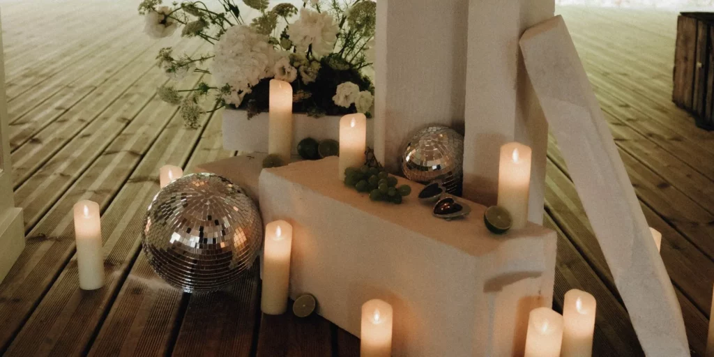 Éclairages d’ambiance étudiés (contre-jours, points d’accent, bougies en cascade)